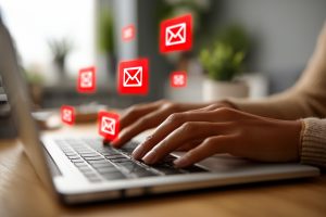 Hands typing on a laptop keyboard with red warning email icons appearing, symbolizing computer virus threats, online security risks, and the need for protection against cyber attacks